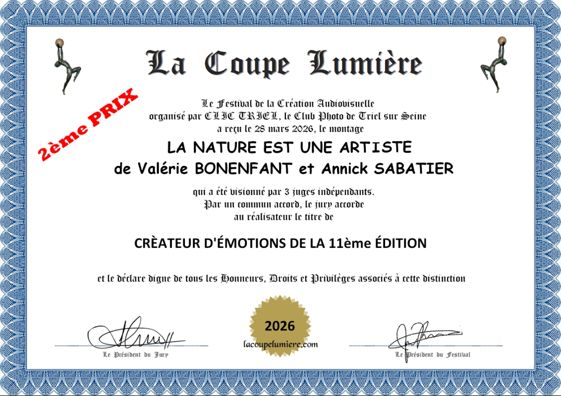 C’est une magnifique nouvelle qui nous a été communiquée récemment ! Lors de la cérémonie évènement qui s’est tenue le 28 mars au théâtre Octave Mirbeau de Triel-sur-Seine, notre court-métrage photographique « La nature est une artiste » a reçu le 2ème prix de la Coupe Lumière, festival international de création audiovisuelle.